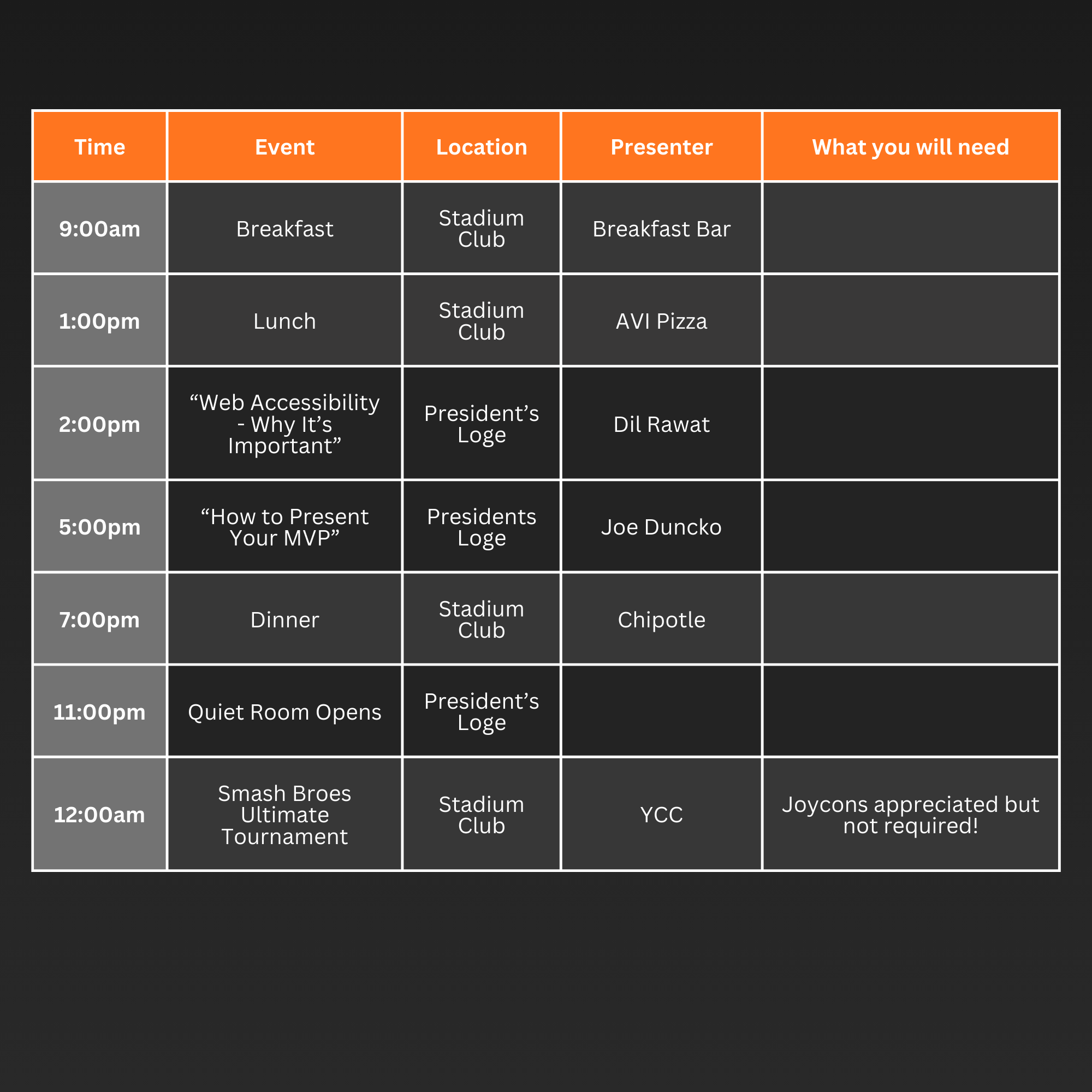 Note: May be outdated if itinerary changes mid-event. Check with an organizer if you are uncertain.