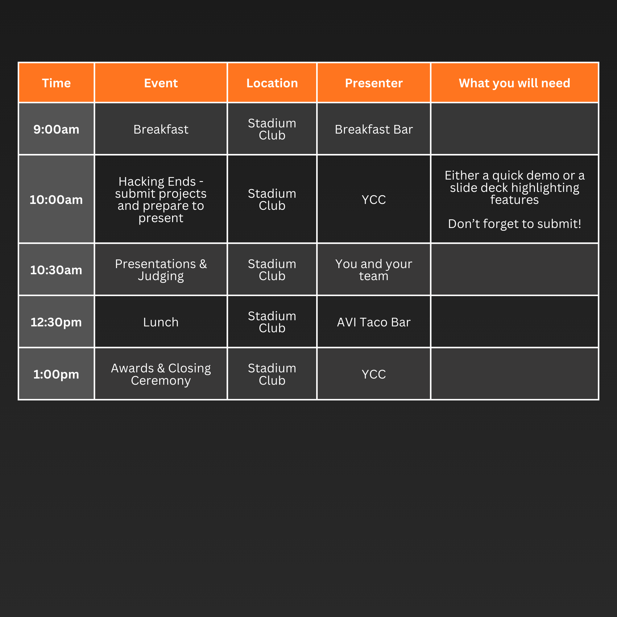 There will be an intinerary full of workshops to inspire you. Whether its a website, game, application, hardware, a data science solution or something you just made on the computer we want to see it!*